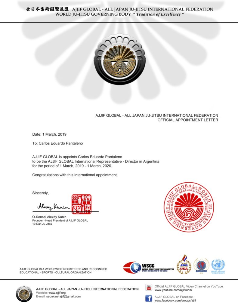 Maestro Carlos E. Pantaleno AJJIF Director en Argentina Posted on April 11, 2019April 11, 2019 by Sakura Sakura JuJitsu Academy tiene el privilegio de compartir desde la AJJIF que nuestro maestro Carlos Pantaleno continuara siendo el Representante Internacional director en Argentina.